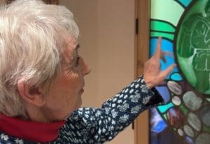 “I was fired by enthusiasm that they were given licences to take the coal they needed, but would have to find their own way in the dark, perhaps wade through water and I wanted him to look like a spirit. The freeminer is in the centre in a cavern and this is supposed to represent all the colours of the wonderful Forest of Dean. The centre part took me about two weeks- it was a question of drawing an image on dark green glass on plain white and I had to acid-etch into the green to reveal. All the background was covered in bee’s wax and dropped in hydrofluoric acid, which is beastly stuff. I did quite a number of panels in those days and I restored church windows and I enjoyed doing that – it was quite a change from teaching art!”