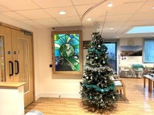The blue and green stained-glass window depicts a Forest free miner, and holds deep cultural and historical significance for the Forest community. Its return to Colliers Court not only enhances the reception environment but also reconnects staff, patients, and visitors with an important piece of local history.